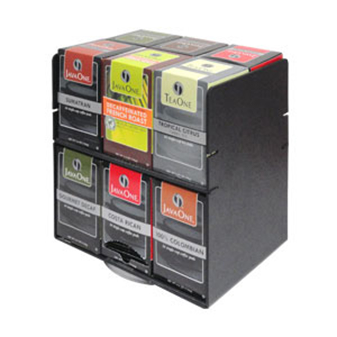 12 Selection Pod rack for holding pods that includes a top that hold condiments. Makes storing pods stylish and convenient.