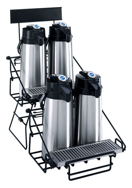 Add Curtis’ Airpot Racks to your airpot program and quickly create remote coffee service centers. Compact design with integral drip tray holder and 3" high merchandising channel. Available in capacities for any service application.