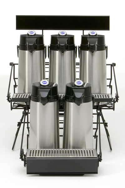 Add Curtis’ Airpot Racks to your airpot program and quickly create remote coffee service centers. Compact design with integral drip tray holder and 3" high merchandising channel. Keep your airpots organized and readily available with the Wilbur Curtis WR5B0000 black five airpot wire rack! This rack is large enough to hold five airpots filled with your most popular coffee, and its durable wire structure makes it conveniently lightweight and easy to clean. And thanks to the included drip tray, you can be sure your countertop will stay clean throughout the day. Available in capacities for any service application.