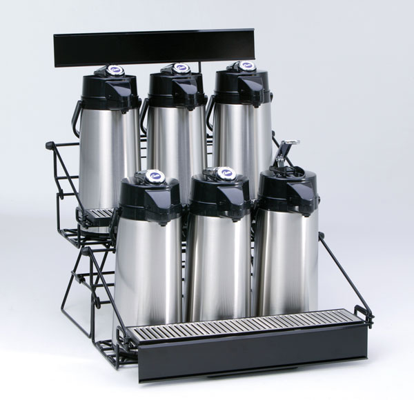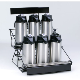 Setting up a coffee station is an excellent way to keep customers from bunching up at the counter and gives them the freedom to get a refill and make their cup of java to their liking. This Six Airpot Rack (WR6B0000) from Curtis is a great choice for cafes, buffets and caterers that need a compact solution for creating a coffee station. It features a step-up design that accommodates six standard sized airpots so that you can expand your coffee service without having to expand your countertop. A three inch high merchandising channel provides space for custom signage and integral drip tray holders helps keep your station clean. WIll hold 6 - 2.2L Airports.