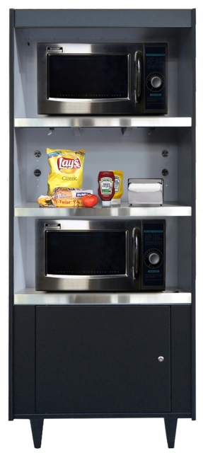 Condiment Stand for up to 3 microwaves. Units feature 20-amp receptacles and can accommodate up to 3 microwaves, or brewer, toaster ovens, etc. Double-wall metal construction. Durable vinyl-clad steel fronts. Stainless steel work shelves. Cabinet mounted, 20 amp receptacles (one per shelf). 12 foot electrical cords. Stain resistant gray interior. Bison Black.