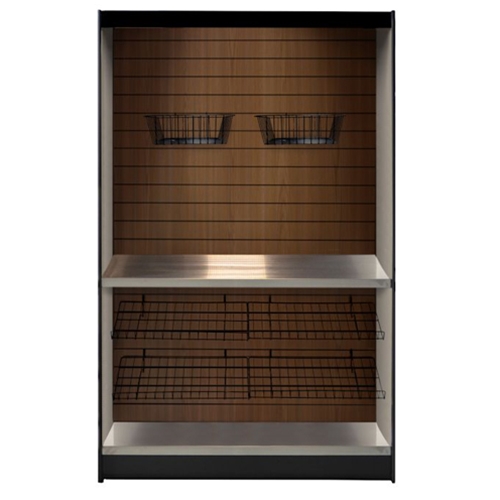 This unit can be used for either a coffee station as shown or as a pay station. It has an LED light for better product display with minimal use of electricity. The MMS 492 is built using our durable double-wall construction. Included is one LED light, 2 built in stainless shelves. Free Options include choice of black or platinum color on the inner walls, choice of oak, walnut, or stainless steel slats. Other upgrade options offered for your convenience are – An economical surge protector for electric, video, modems, with convenient 10 foot power cord. Display kits pictured are not included and must be purchased separately.