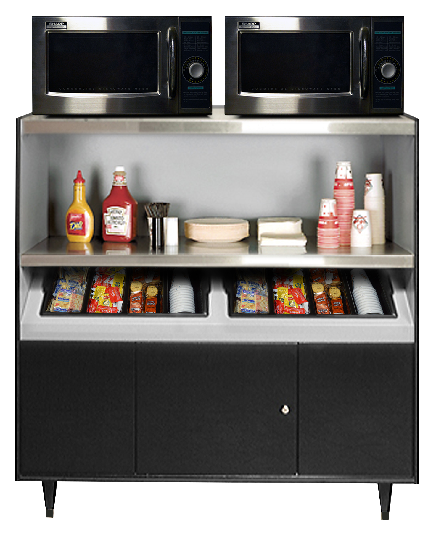Flexible multipurpose unit with stainless steel shelves and 2 condiment tray. This low-top unit provides storage and counter top space for coffee brewers, microwaves and condiments. Short-stop 1/2-inch lip keeps items from falling off top. Includes 20-amp receptacles.