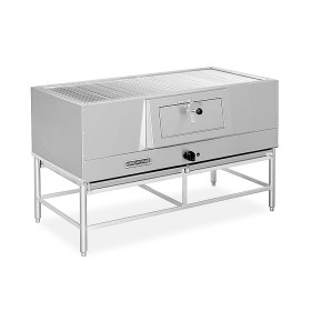 - Large stainless steel door with handle located on front of the broiler allows easy loading and moving of wood/charcoal.
