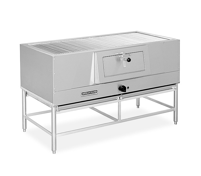 - Large stainless steel door with handle located on front of the broiler allows easy loading and moving of wood/charcoal.