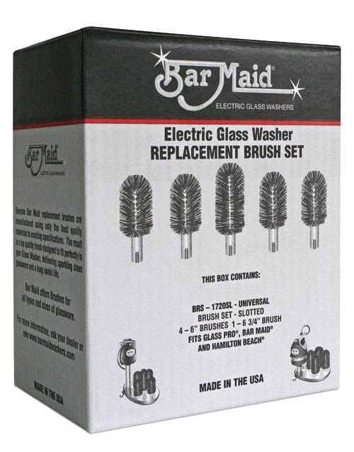 The Bar Maid universal electric glass washer replacement brush set includes four 6 inch brushes and one 6.75 inch brush. Packaged in a retail display box. Includes slotted brushes and locking pins. Fits all current models of Bar Maid, Glass Pro and Hamilton Beach electric glass washers.