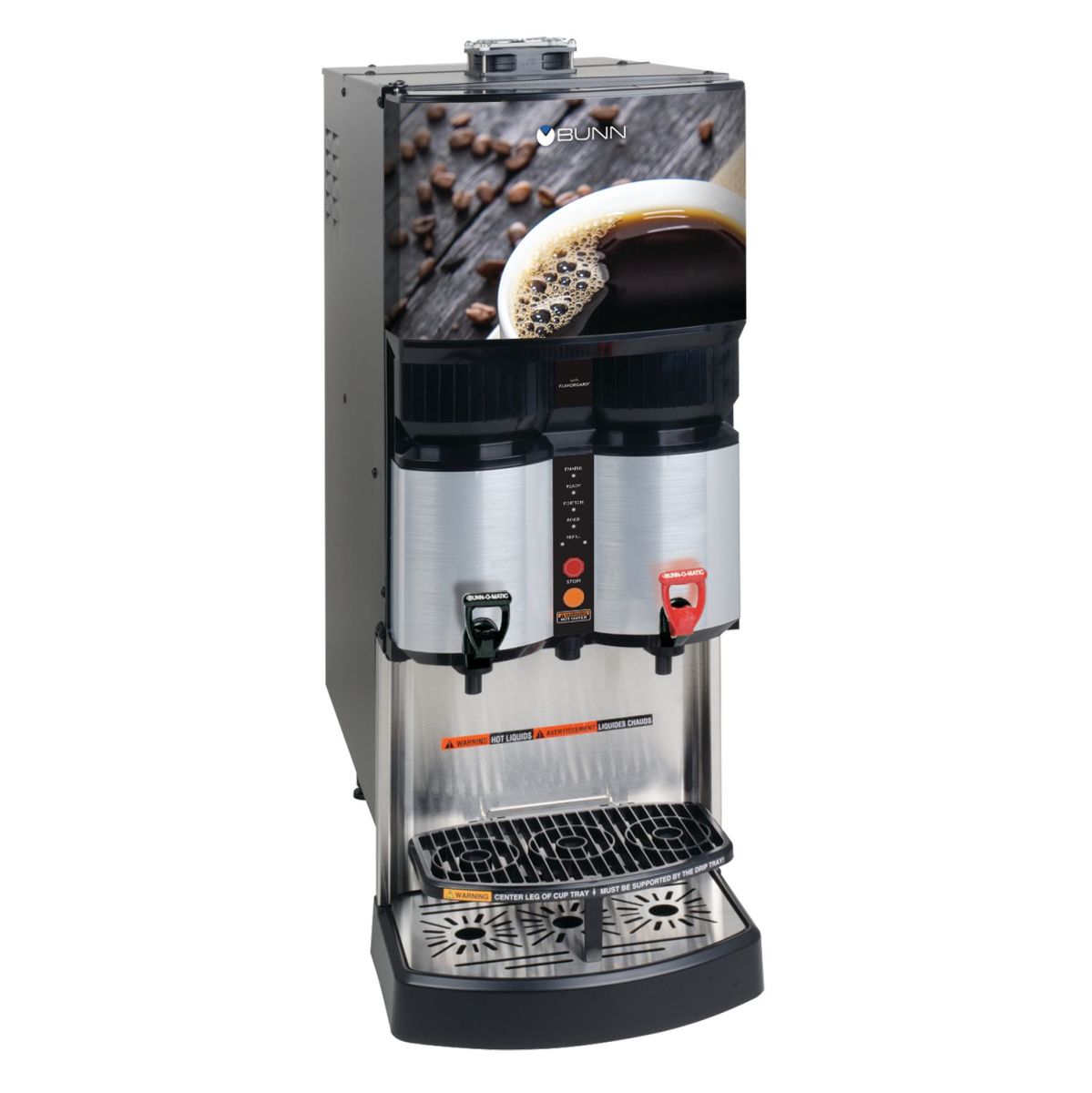 This liquid coffee dispenser offers an attractive design and a convenient size at 12" wide. You won't have to worry about an improper brew cycle or a random batch of low quality grounds since Bunn's FlavorGard technology continuously monitors the extract-to-water ratio to ensure absolute flavor consistency. This "coffee on demand" unit is able to dispense up to (125) 5 oz. cups per hour because no brewing is required, making it an excellent option for hospitals, hotels, catered events, and more!