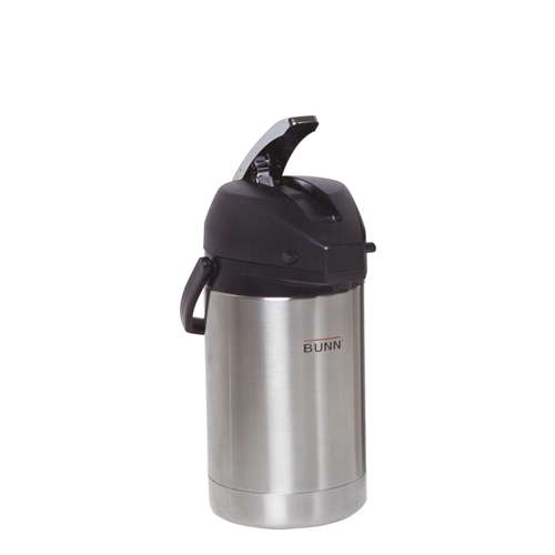 This Bunn 2.5 liter lever action airpot features an unbreakable liner and brew-through pump assembly that allows you to brew directly into the airpot from Bunn Axiom, CWTF, VPR-APS, or CW15 airpot brewers. With its easy transport handle and simple lever design, the Bunn 2.5 liter lever action airpot is ideal for cafes, hotels, convenience stores, or break rooms.
