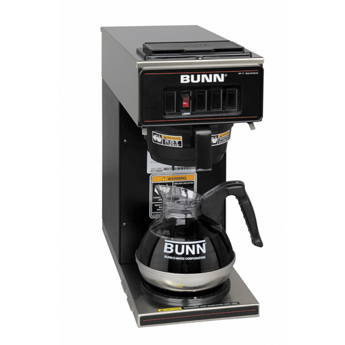 The Bunn VP17-1 BLK pourover coffee brewer can brew up to 3.8 gallons per hour directly into standard 64 oz. decanters. Its stainless steel exterior with a black finish allows for quick, easy clean up and a black plastic SplashGuard funnel protects the user from burns.