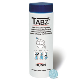 Tabz Super Concentrated Coffee Brewer Cleaning Tablets are specifically designed to offer one-step cleaning for coffee brewers and servers. By running a brew cycle with a Tabz tablet in the basket users can simultaneously clean both the brew basket and server beneath. Additional Tabz may be used directly in servers to quickly clean systems with multiple vessels. As an added safety feature Tabz tablets contain a blue dye which helps insure proper rinsing in busy service environments. Case of 12 containers.