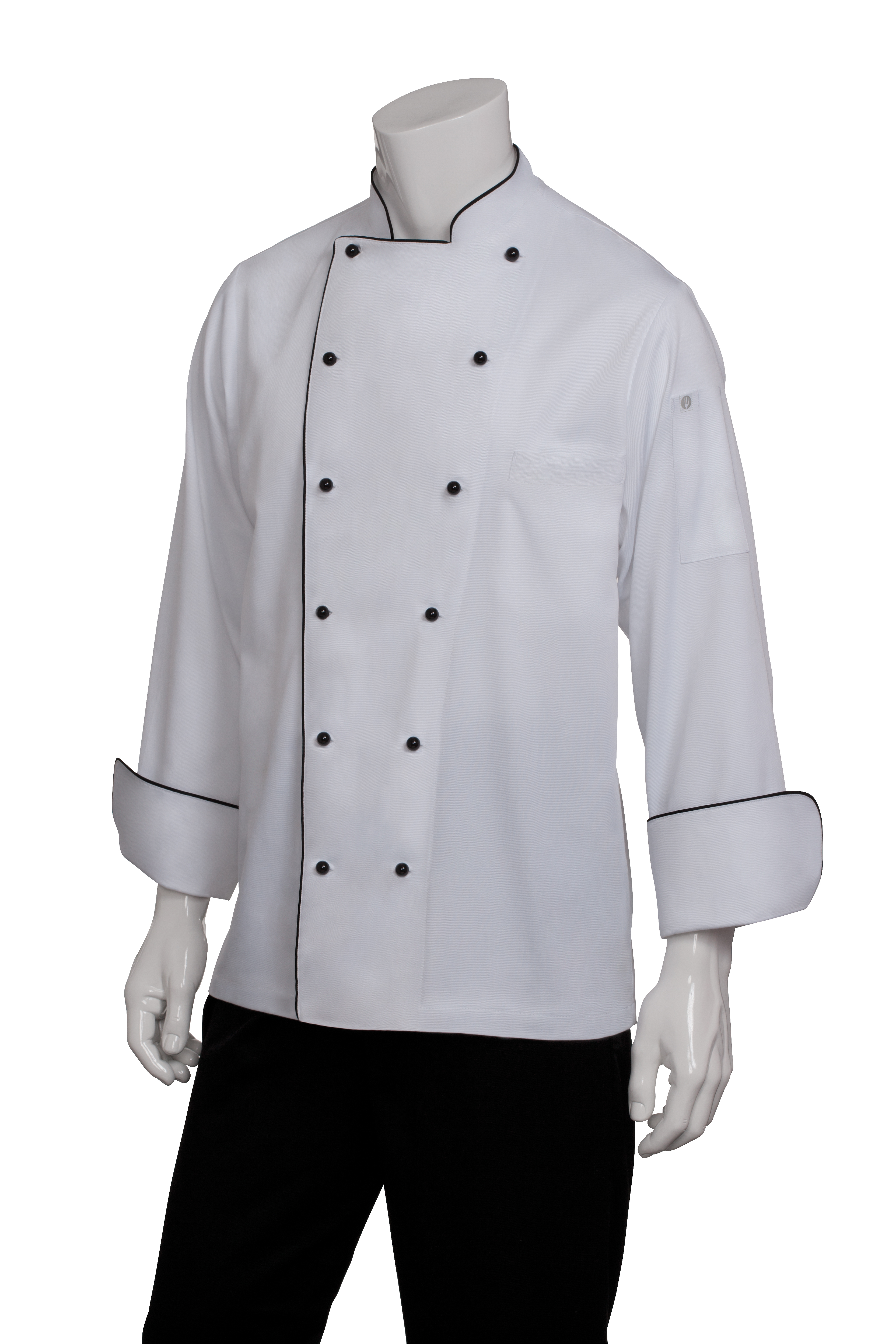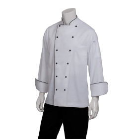 - Black piping on collar, center front and cuffs