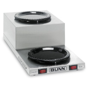 Merchandise the tempting aroma and exquisite appearance of fresh coffee at self service stations with this dual burner Bunn WL2 Stainless Steel step up decanter warmer. Thanks to its step up design, the Bunn WL2 coffee pot warmer takes up less horizontal "real estate" and provides easy access to decanters on the back burner.