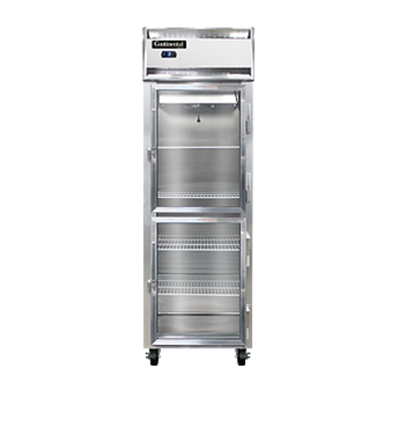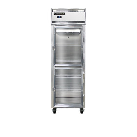 Freezer, display, one-section, self-contained refrigeration, stainless steel exterior & interior, shallow depth, narrow hinged glass half doors, electronic controller w/ digital display, 5" casters, 1/2 hp