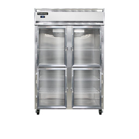 Freezer, display, two-section, self-contained refrigeration, aluminum exterior & interior, stainless steel front, standard depth, narrow hinged glass half doors, electronic controller w/ digital display, electric condensate evaporator, 5" casters, 1 hp