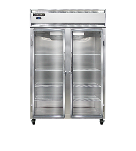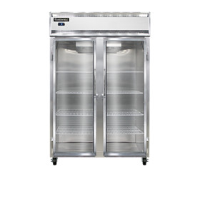 Freezer, display, two-section, self-contained refrigeration, stainless steel exterior & interior, shallow depth, narrow hinged glass doors, electronic controller w/ digital display, 5" casters, 1 hp