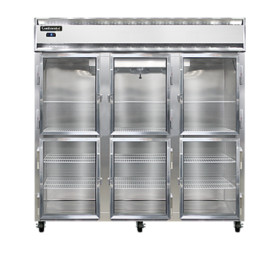 Freezer, display, three-section, self-contained refrigeration, aluminum exterior & interior, stainless steel front, standard depth, narrow hinged glass half doors, electronic controller w/ digital display, electric condensate evaporator, 5" casters, 1-1/2 hp