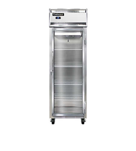 Designer Line Refrigerator, reach-in, one-section, self-contained refrigeration, stainless steel exterior & interior, shallow depth cabinet, full-height glass door, exterior digital thermometer, 6" stainless steel legs, 1/3 hp