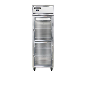 Designer Line Refrigerator, reach-in, one-section, self-contained refrigeration, stainless steel exterior & interior, shallow depth cabinet, half-height glass door, exterior digital thermometer, 6" stainless steel legs, 1/3 hp