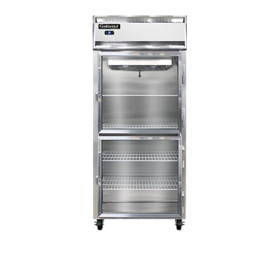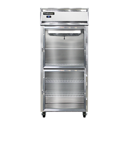 Designer Line Extra-Wide Refrigerator, reach-in, 36-1/4" wide one-section, self-contained refrigeration, aluminum exterior & interior, stainless steel front, standard depth cabinet, wide half-height glass doors, exterior digital thermometer, 6" adjustable stainless steel legs, 1/3 hp