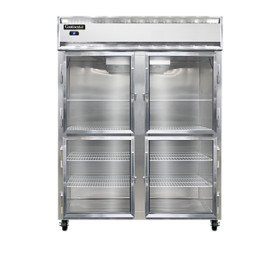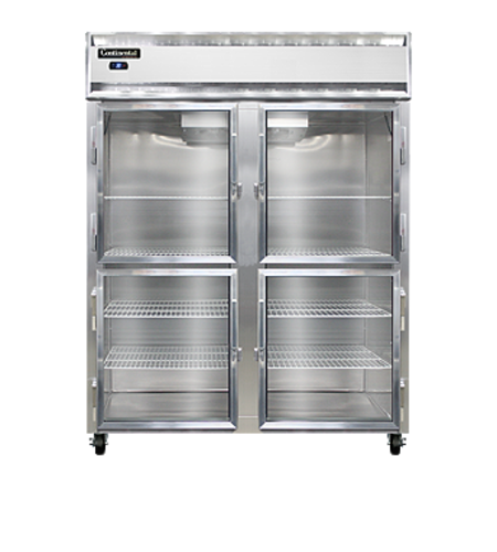 Designer Line Wide Refrigerator, reach-in, 57" wide two-section, self-contained refrigeration, aluminum exterior & interior, stainless steel front, shallow depth cabinet, wide half-height glass doors, exterior digital thermometer, 6" stainless steel legs, 1/2 hp
