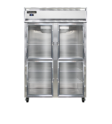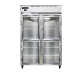 Designer Line Refrigerator, reach-in, two-section, self-contained refrigeration, stainless steel exterior & interior, shallow depth cabinet, half-height glass doors, exterior digital thermometer, 6" stainless steel legs, 1/2 hp