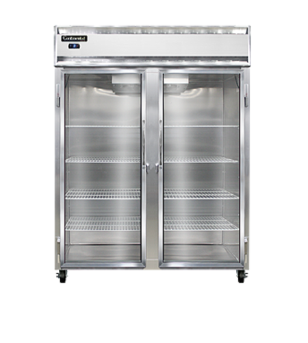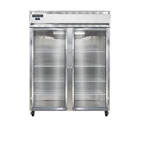 Designer Line Wide Freezer, reach-in, 57" wide two-section, self-contained refrigeration, aluminum exterior & interior, stainless steel front, standard depth cabinet, wide full-height glass doors, exterior digital thermometer, 6" stainless steel legs, 1 hp