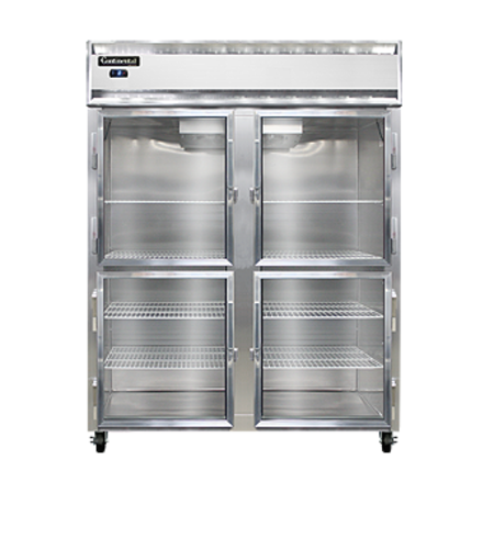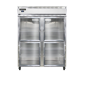 Designer Line Wide Freezer, reach-in, 57" wide two-section, self-contained refrigeration, aluminum exterior & interior, stainless steel front, standard depth cabinet, wide half-height glass doors, exterior digital thermometer, 6" stainless steel legs, 1 hp