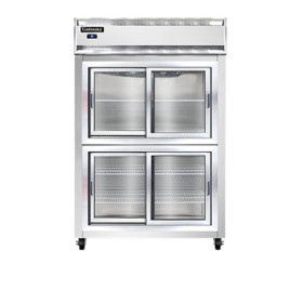 Designer Line Refrigerator, reach-in, two-section, self-contained refrigeration, stainless steel exterior & interior, standard depth cabinet, half-height sliding glass doors, exterior digital thermometer, 6" stainless steel legs, 1/2 hp