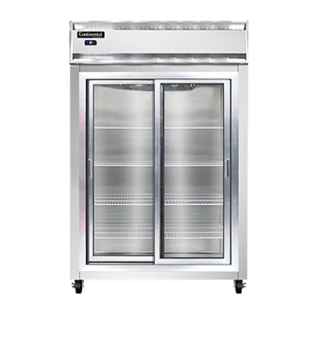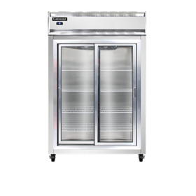 Designer Line Refrigerator, reach-in, two-section, self-contained refrigeration, stainless steel exterior & interior, standard depth cabinet, full-height sliding glass doors, exterior digital thermometer, 6" stainless steel legs, 1/2 hp