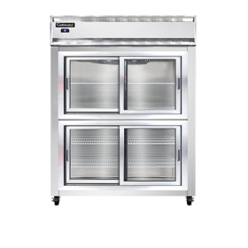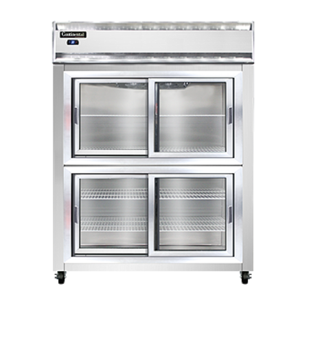 Designer Line Wide Refrigerator, reach-in, 57" wide two-section, self-contained refrigeration, stainless steel exterior & interior, standard depth cabinet, wide half-height sliding glass doors, exterior digital thermometer, 6" stainless steel legs, 1/2 hp
