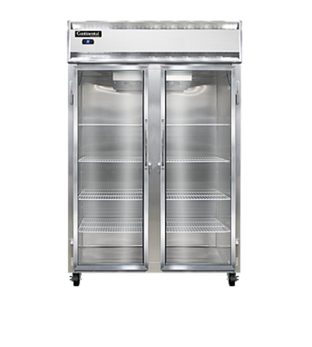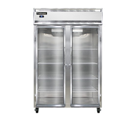 Designer Line Refrigerator, reach-in, two-section, self-contained refrigeration, stainless steel exterior & interior, shallow depth cabinet, full-height glass doors, exterior digital thermometer, 6" stainless steel legs, 1/2 hp