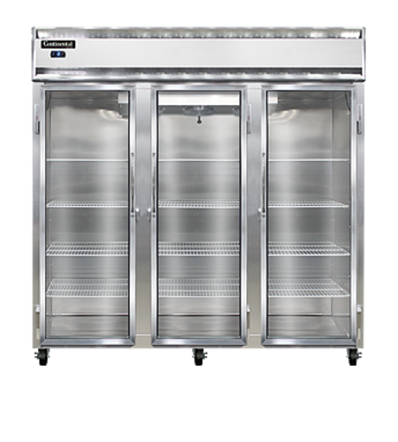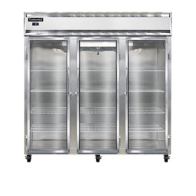 Designer Line Freezer, reach-in, three-section, self-contained refrigeration, aluminum exterior & interior, stainless steel front, standard depth cabinet, full-height glass doors, exterior digital thermometer, 6" stainless steel legs, 2 hp