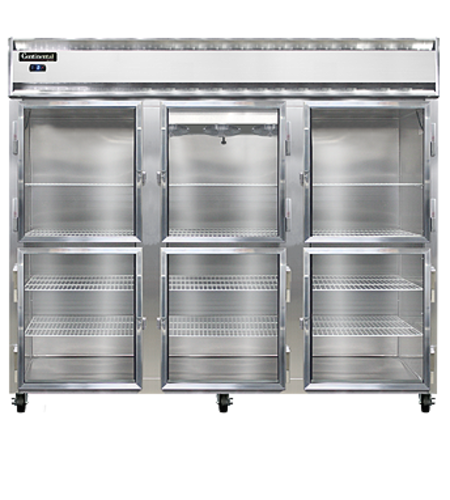Designer Line Wide Freezer, reach-in, 85-1/2" wide three-section, self-contained refrigeration, aluminum exterior & interior, stainless steel front, standard depth cabinet, wide half-height glass doors, exterior digital thermometer, 6" stainless steel legs, 2 hp