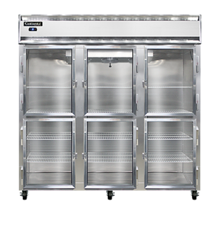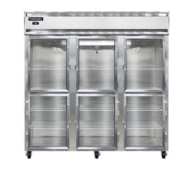 Designer Line Refrigerator, reach-in, three-section, self-contained refrigeration, stainless steel exterior & interior, standard depth cabinet, half-height glass doors, exterior digital thermometer, 6" stainless steel legs, 1 hp