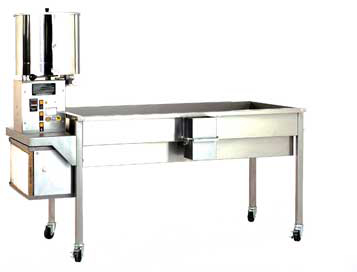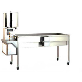 The CMD 50 Caramelizer with 6 Foot Cooling Table with fan will create a small popcorn caramel corn production plant. The caramelizer is mounted on an existing or custom built Cretors popping table or cooling bin. Mixing baffles in the caramelizer simplify the coating process. Popcorn is cooled in a uniform manner, product clumps less and breakage is reduced during the cooling process. Optional built in blowers send cool air up through the perforated stainless steel receiving tray for quicker cooling time. The corn chute allows easy transfer of coated popcorn from receiving tray to storage containers.