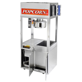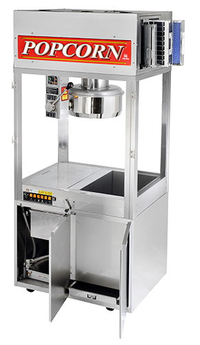 All stainless steel cabinet and base, two halogen lights and heat lamps are just the beginning! Two Halogen Lights, two heat lamps, and optional customer programmable LED sign sets this machine apart from all the rest in the industry. The popper has a direct drive agitator motor, single thermostat, and an exclusive counter-balance kettle dump and return system with automatic cover lift and eye level lighted rocker switches make the machine easy to operate. The clean-in-place kettle is available in stainless steel or nickel plated, all steel which resist corrosion. Cycling pilot light indicates thermostat is operational and the machine is ready for production. Disposable filter system makes machine maintenance easy and quick. Optional upgrades include Cretors exclusive cornditioner system keeps corn dry and crisp until served. Other options include integrated pump, Sweet/Salt corn switch, One-pop control, and One-Pop with counter, Popit & Topit, bin elevator and bag filler. Show with optional base included.