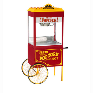 The T-3000 Plus Popper is made of stainless steel welded construction. Upgrades for the T-3000 Plus include the Cretors exclusive hot-air conditioner system, and wiring and tubing for automatic pump installation. Standard features include a one-piece clean-in-place stainless steel or nickel plated all-steel kettle which has a twist lock plug for easy removal if necessary. The counter-balance dump system makes dumping the kettle easy and efficient. The cabinet contains a heat lamp that keeps popcorn fresh and warm until serving. Rocker control switches at eye level provide easy operation with illuminated kettle heat switch. Other features include a heated corn deck, drop shelf, and tempered safety glass windows. The Red top is painted with Cretors special powder coating that resists scratching. A matching two-wheel red cart is also included. The popper is UL and UL Sanitation approved. The steel wagons have Cretors special powder-coating that resists scratching. The simple design includes a rigid cross-leg support that ensures the wagon is study and stable. Designed for use with 12 oz. portion packs. Capable of producing 240 one ounce servings per hour. Cart Shown on next page.
