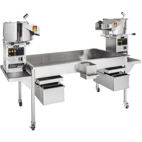 Cretors TGSX-X-X-PP Twin Shelf Giant Special Popping Table Plant Assembly 81" Shown with CMD50 Caramelizer and 60oz Popper not included.