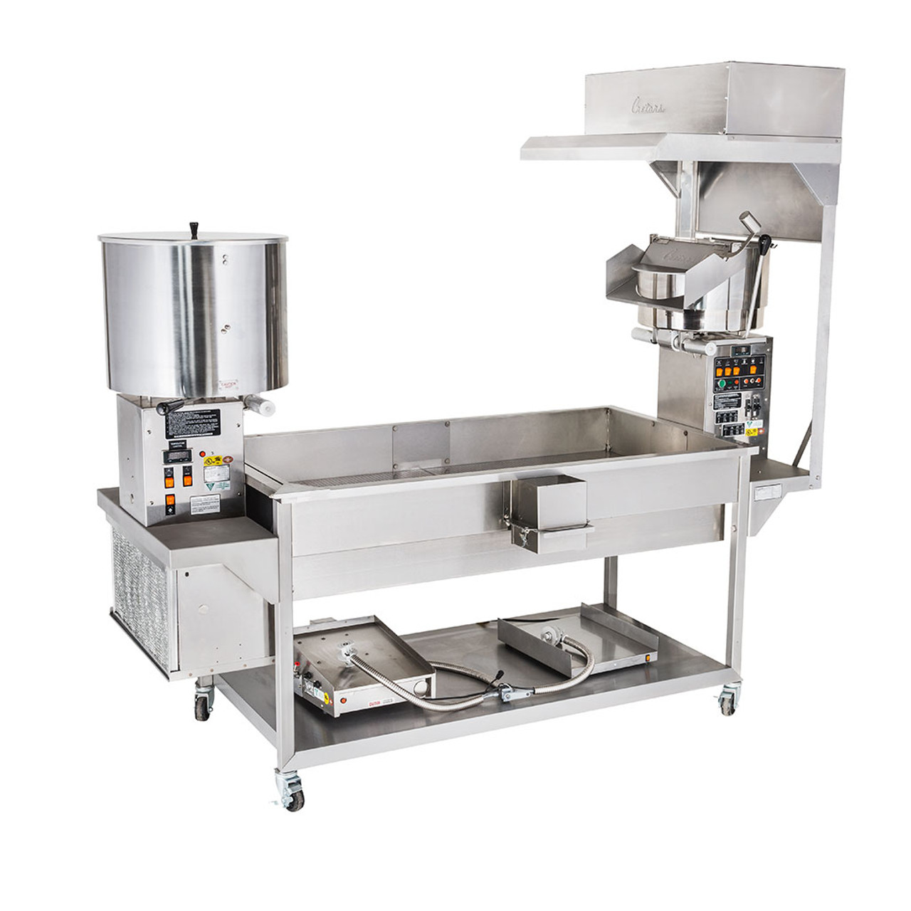 Our original two mixing baffle design improve the coating process and efficiency, providing a well coated product. An aluminum heat plate is used for optimal heat control while eliminating hot spots. An adjustable digital display and control is designed for precise temperature settings and measures actual product temperature. An audible alarm indicates when temperature is reached. Stainless steel mixing bowl, agitator blade and pedestal make it durable and easy to clean. Cretors 6ft. Twin Knock Down Production Table with Blower is constructed of durable rust-proof stainless steel. Two shelves provide a surface for the Cretors Electric Giant Popper and Cretors CMD 25 Cooker and Coater to be installed. Locking casters make moving the table easy and effortless. Popcorn is cooled in a uniform manner, product clumps less and breakage is reduced during the cooling process. Built in blowers send cool air up through the perforated stainless steel receiving tray for quicker cooling time. The corn chute allows easy transfer of coated popcorn from receiving tray to storage containers.