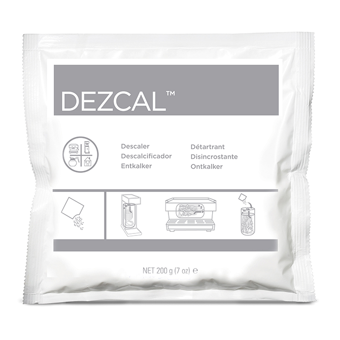Dezcal™ Activated Scale Remover is specifically formulated to effectively descale hot water tanks and components of coffee and espresso machinery. By removing mineral deposits which clog and impair brewing equipment, Dezcal™ allows machines to perform at optimal levels. Non-toxic and bio-degradable, Dezcal™ is suitable for use by both professional technicians and home users alike. When used on commercial and "closed system" brewers (with a holding tank), special attention should be paid to rinsing.