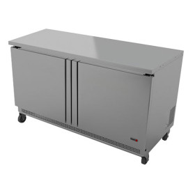 Undercounter Refrigerator, 60" wide, 15.0 cu.ft., two-section, (2) doors, (4) adjustable epoxy coated wire shelves, front breathing self-contained refrigeration, 4" castors front 2 with brakes, s/s interior & exterior, ABS interior liner, 1/2 hp, cETL, UL, NSF