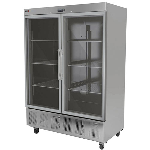 QV Series Refrigerator, reach-in, two-section, 49 cu.ft., digital display thermometer, interior fluorescent light, (6) adjustable wire shelves, s/s interior & exterior, aluminum interior liner, std. depth accepts 18" x 26" bun trays, (2) glass doors, 4" castors front 2 with brakes, bottom mount self-contained refrigeration, 1/2 hp, cETL, UL, NSF-7