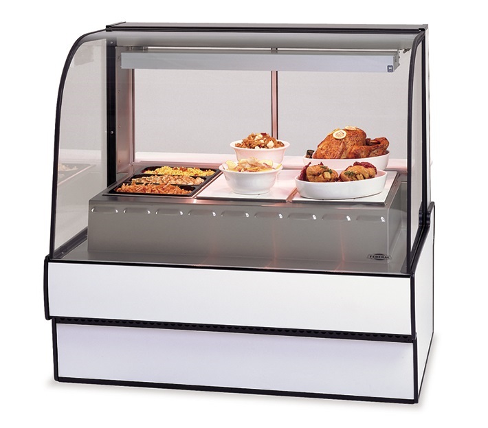 Wet or dry heat, five wells, independently controlled stainless steel heating wells each with a cal-rod heating element, top-mounted full-length infrared heater, curved thermopane tilt-front glass, forced air front-glass defogger, top light, glass sliding rear doors with moisture vents, stainless steel deck, tempered glass ends, removable wrapping board, designed for continuous lineups, choice of laminate, black trim, drain not needed, UL safety and UL sanitation approved