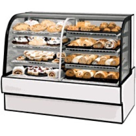 Self contained refrigeration with condensate evaporator, adjustable temperature control, curved thermopane tilt-front glass, top light and lighted shelves, two tiers of adjustable white wire shelves, glass sliding rear doors, white interior, tempered glass ends, choice of laminate with black trim, designed for continuous lineups, UL safety and UL sanitation approved, 1/3 HP
