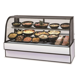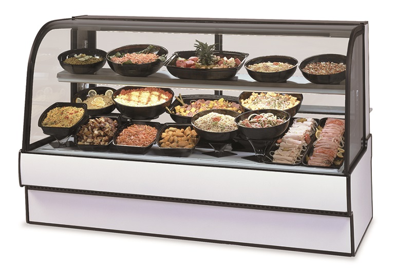 Self contained refrigeration with condensate evaporator, adjustable temperature control, curved thermopane tilt-front glass, top light and lighted shelf, adjustable stainless steel mezzanine shelf, glass sliding rear doors, white scratch resistant display deck, tempered glass ends, removable rear wrapping board, choice of laminate, black trim, designed for continuous lineups, UL safety and UL sanitation approved, 3/4 HP