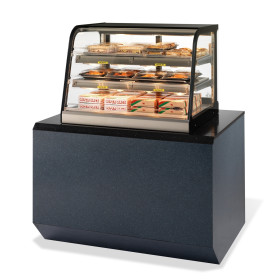 Tempered curved front glass, top light and lighted shelves, two tiers of adjustable stainless steel heated shelves, humidified air system, stainless steel display deck, stainless steel construction with black trim, removable sliding glass rear doors, tempered glass end panels, set directly on counter, cord and plug, UL safety and UL sanitation approved