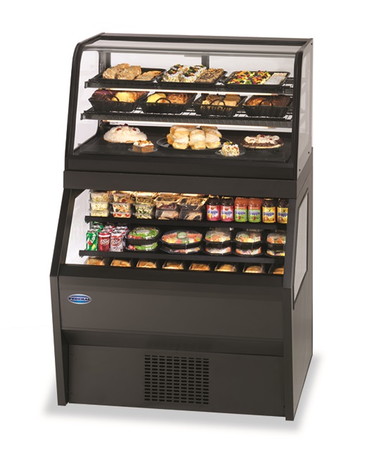 Refrigerated Self-Serve Bottom: black laminated exterior with black trim, horizontal top and front light, two tiers of black metal shelves with black interior, tempered glass ends, Refrigerated Top: glass with black trim, top light with lighted shelves, two tier black wire shelves, sliding rear doors, UL safety and UL sanitation approved, 1/2 HP
