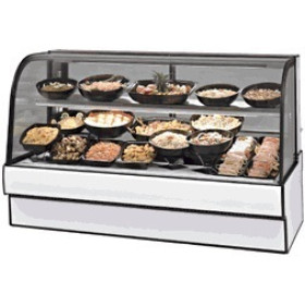 Self contained refrigeration with condensate evaporator, adjustable temperature control, curved thermopane tilt-out front glass, top light and lighted shelf, adjustable stainless steel mezzanine shelf, removable sliding rear doors, stainless steel display deck, stainless steel top and sides, black base, cord and plug, 120v/60hz/1ph electrical, UL safety and UL sanitation approved, 3/4 HP