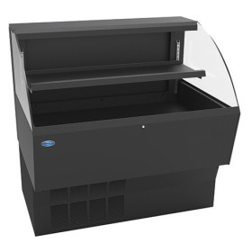 Self contained refrigeration with condensate pump, adjustable temperature control, energy saving night curtain, horizontal top light, one tier adjustable solid black metal shelf, black display deck and black interior, black trim, clear Acrylic ends, cord and plug, 230v/60hz/1ph electrical, DOE 2012 compliant, UL safety and UL sanitation approved, 3/4 HP