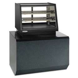 Self contained refrigeration with condensate evaporator, adjustable temperature control, tempered front glass, top light and lighted shelves, two tiers of adjustable black wire shelves, black display deck, black trim, removable sliding glass rear doors, solid end panels, set directly on counter, cord and plug, 120v/60hz/1ph electrical, UL safety and UL sanitation approved, 1/3 HP